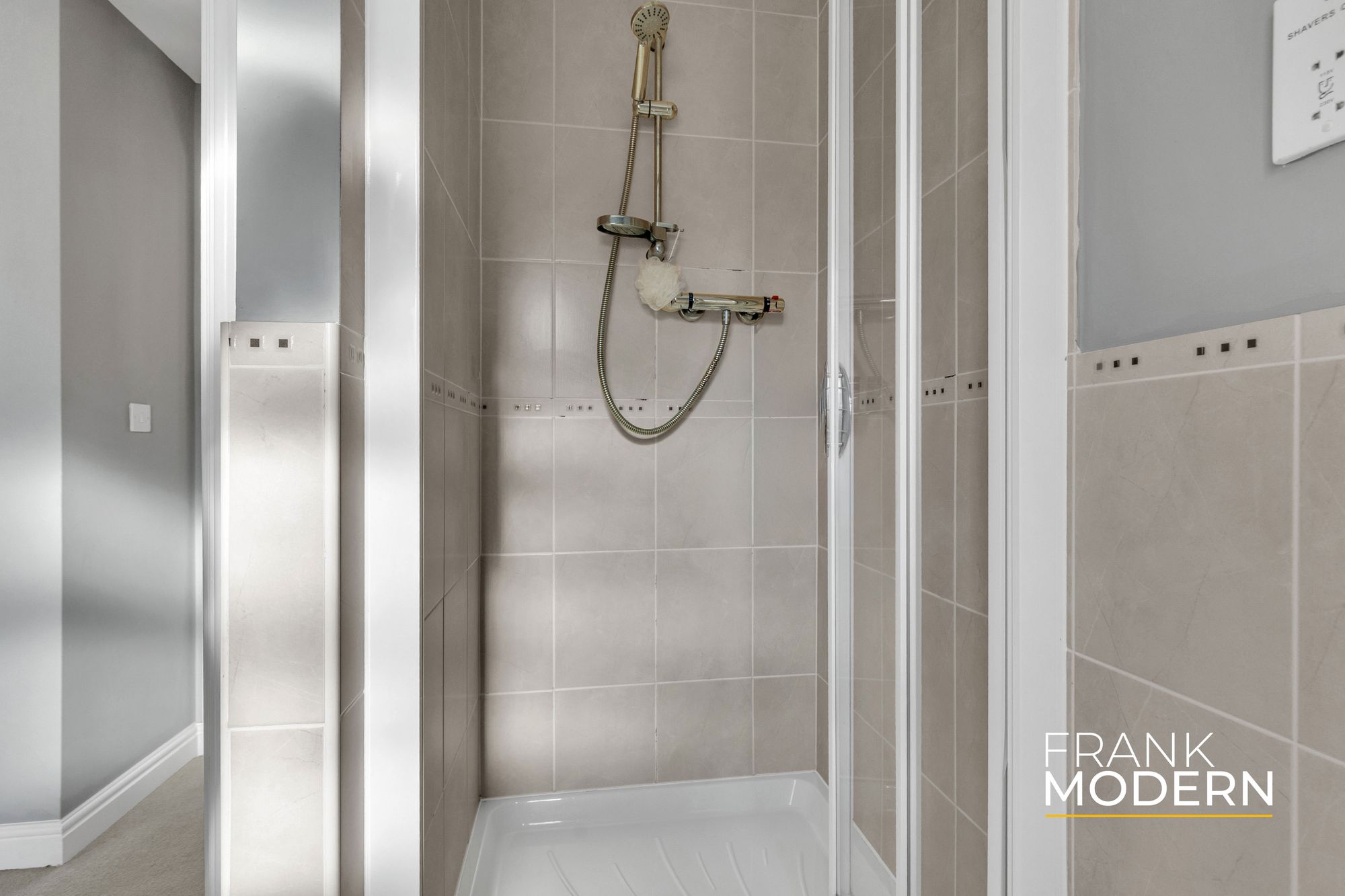 Upstairs, the first-floor landing leads to five well-proportioned double bedrooms. The principal bedroom benefits from built-in storage and a modern three-piece en-suite shower room. Bedroom two also enjoys its own en-suite shower room along with additional storage. The remaining three bedrooms are served by a family bathroom fitted with a white suite.