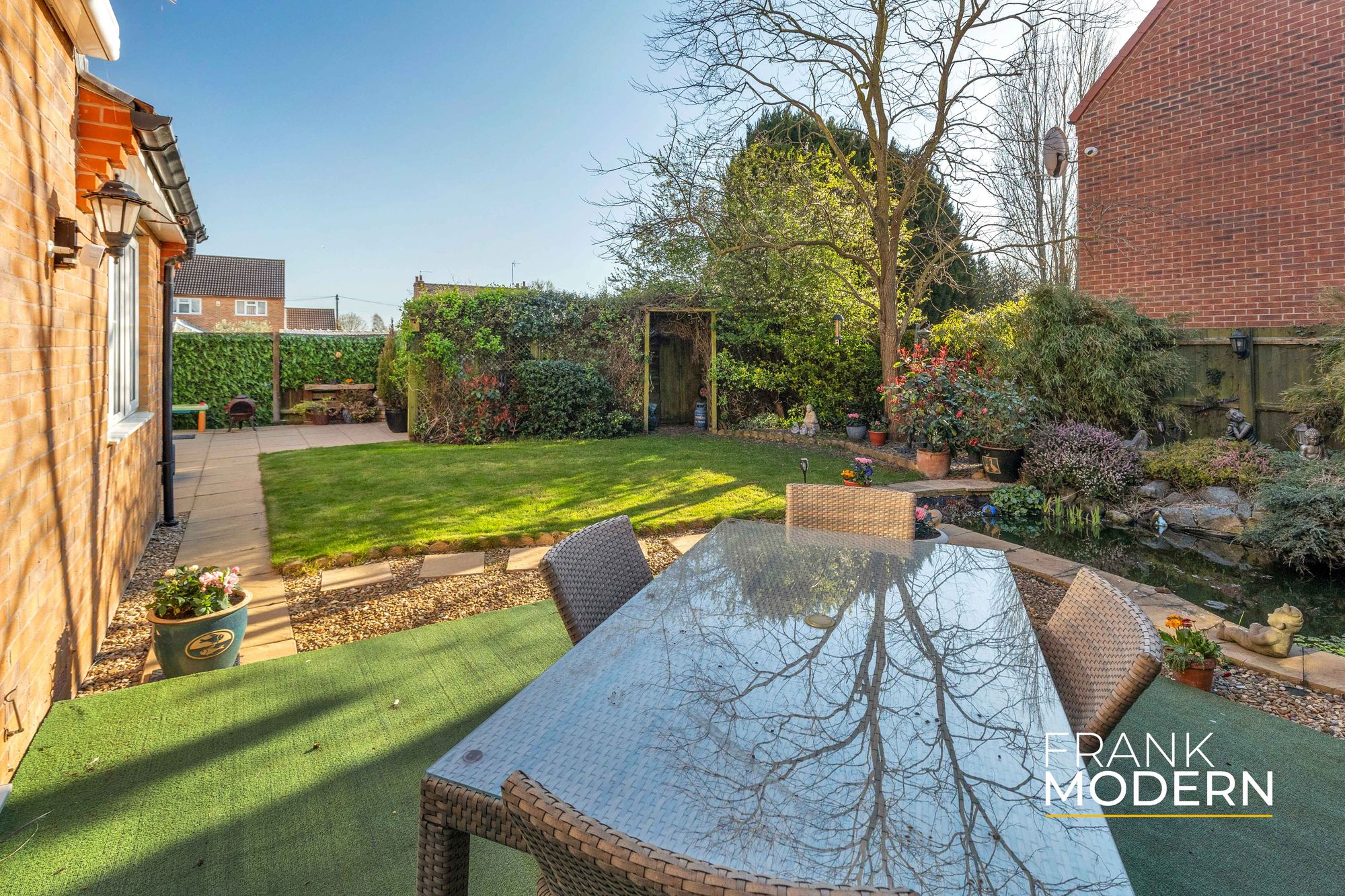 Externally, the property is equally impressive. To the front, a block-paved driveway provides ample off-road parking and leads to a double garage. The rear garden is beautifully landscaped and enjoys a south-west facing aspect, making it ideal for outdoor entertaining. It is thoughtfully divided into several sections, including a paved seating area, a lawned area, all enclosed by timber fencing for privacy.