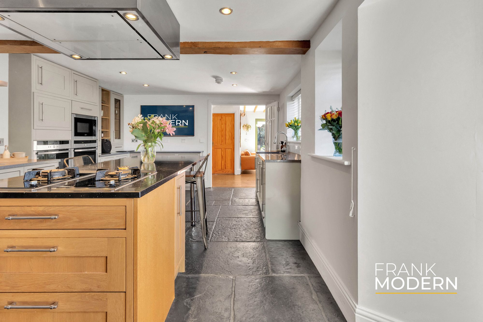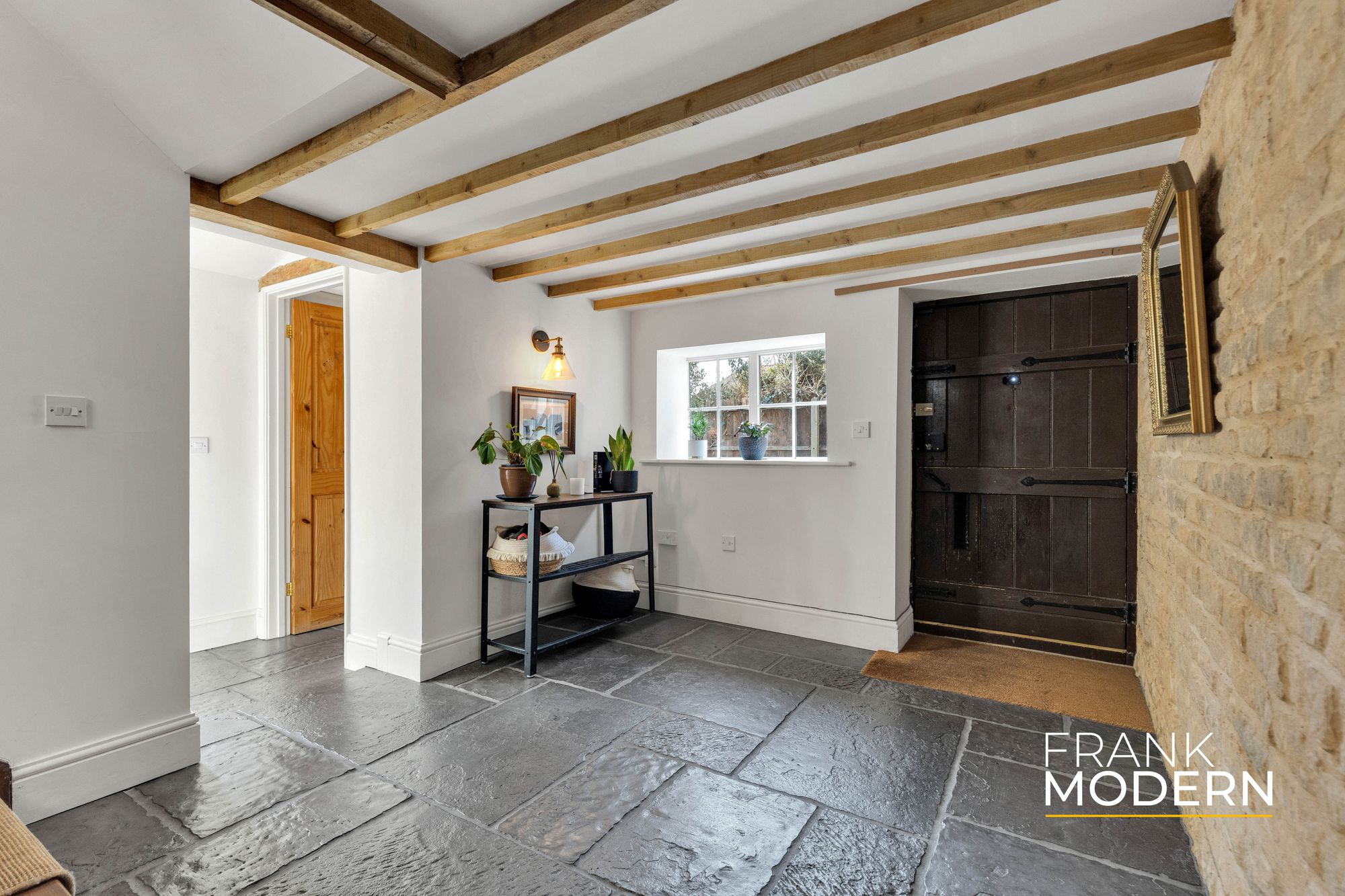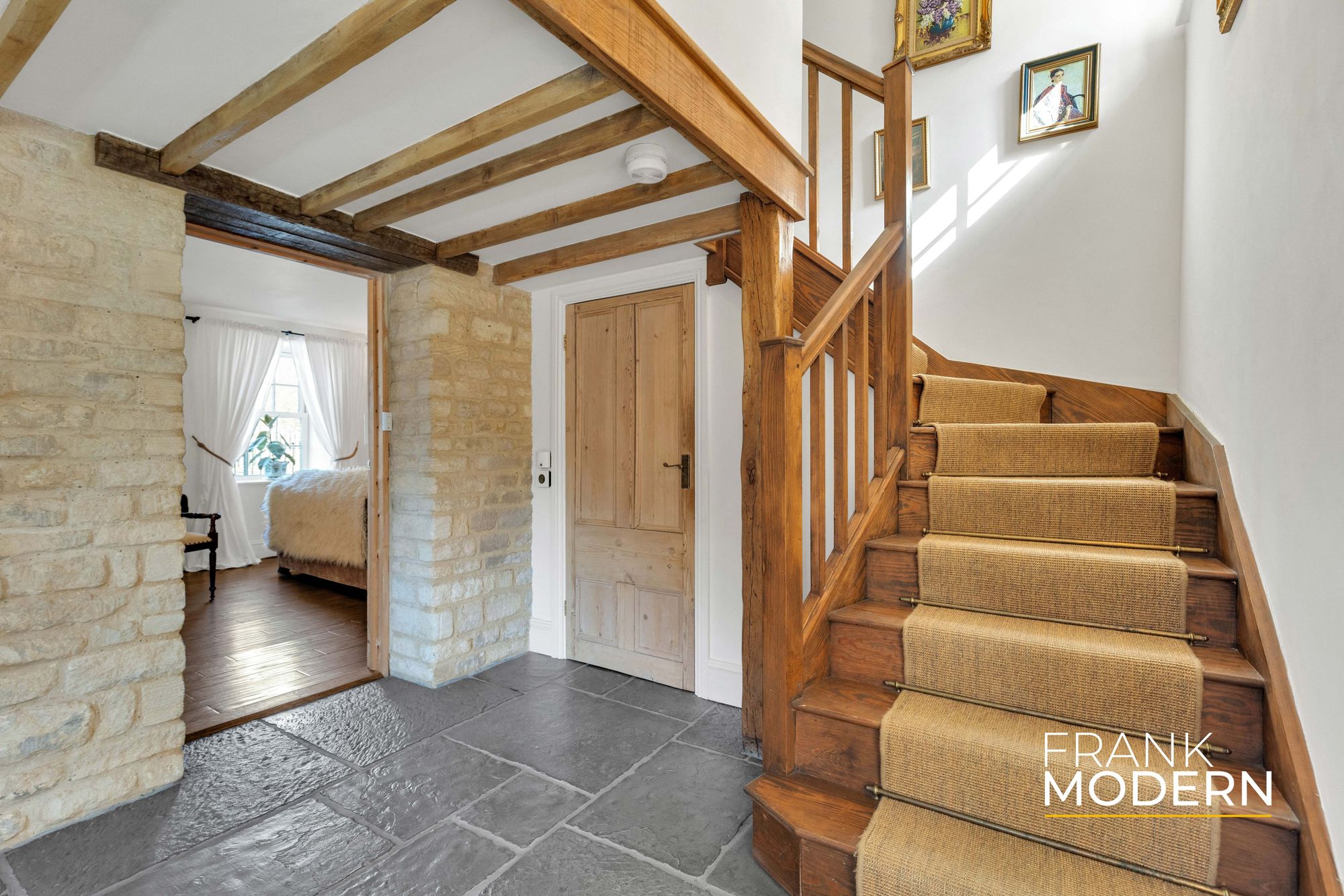 Inside, the home reveals itself gradually. The reception hall, with exposed beams, stonework and flagstone-style flooring, sets the tone – authentic, grounded, and quietly impressive.