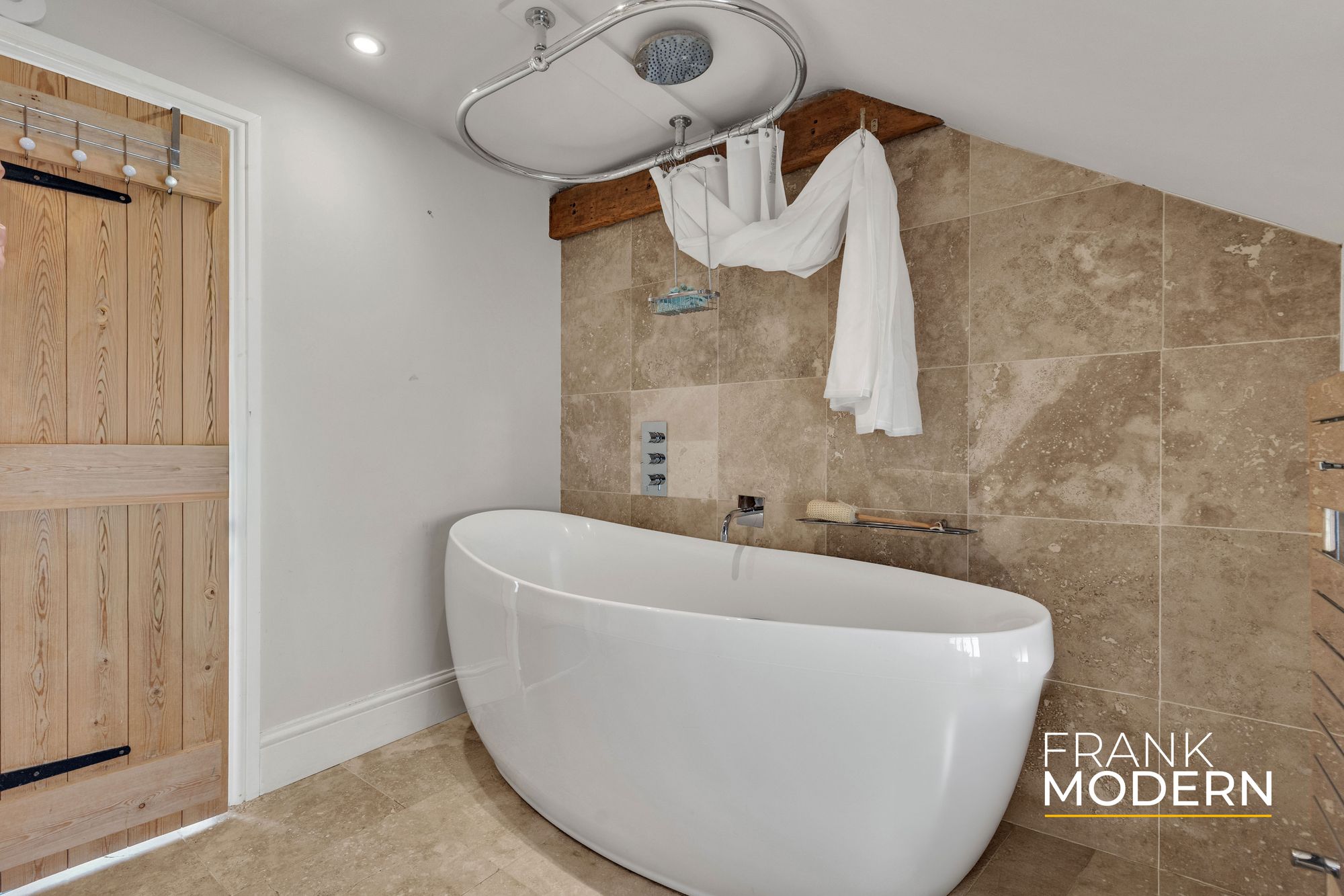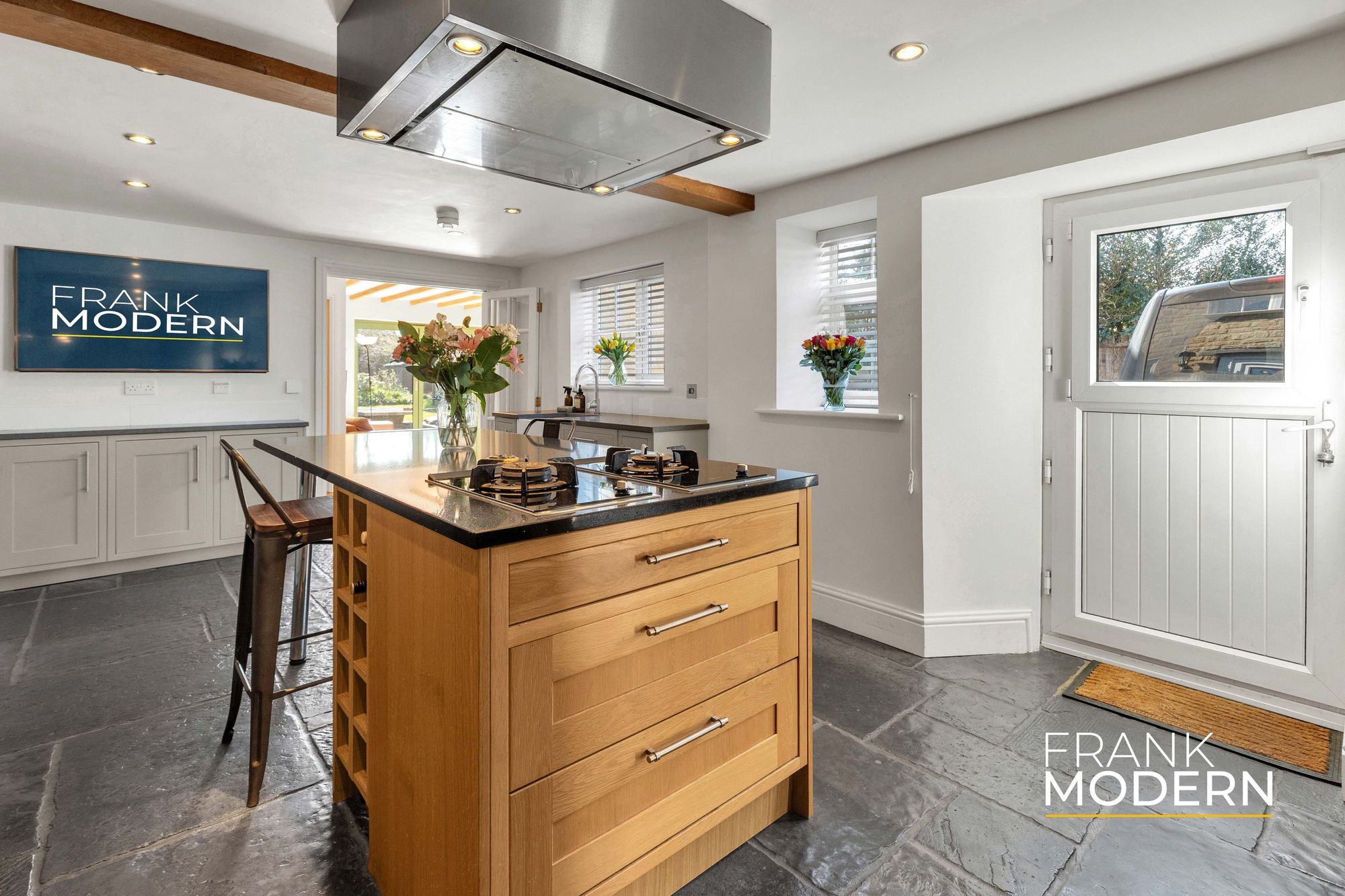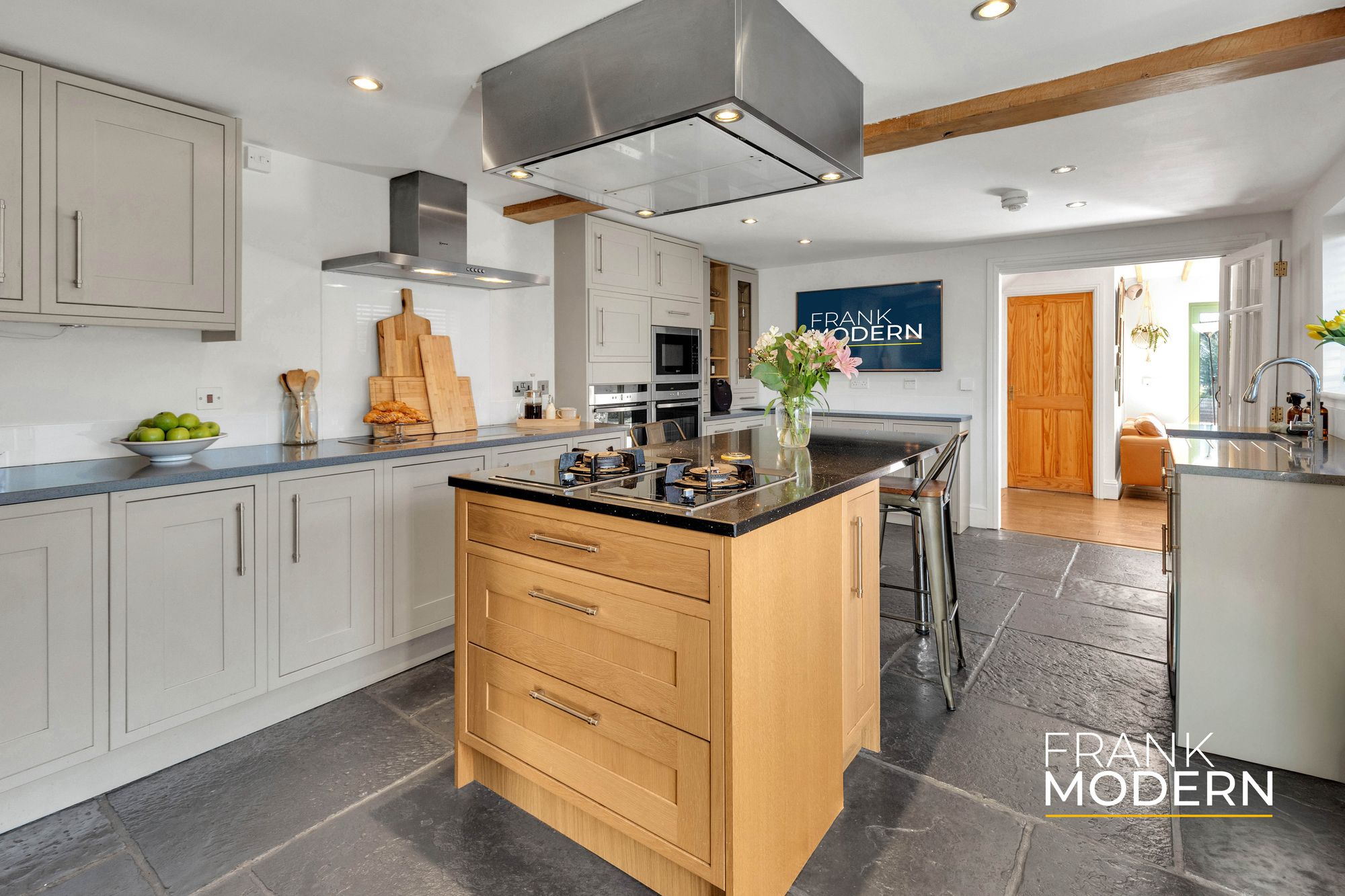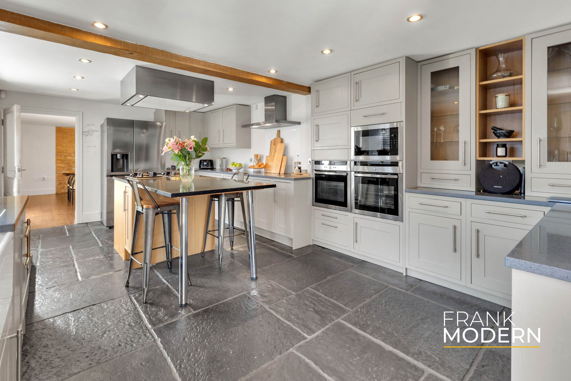 Inside, the home reveals itself gradually. The reception hall, with exposed beams, stonework and flagstone-style flooring, sets the tone – authentic, grounded, and quietly impressive.