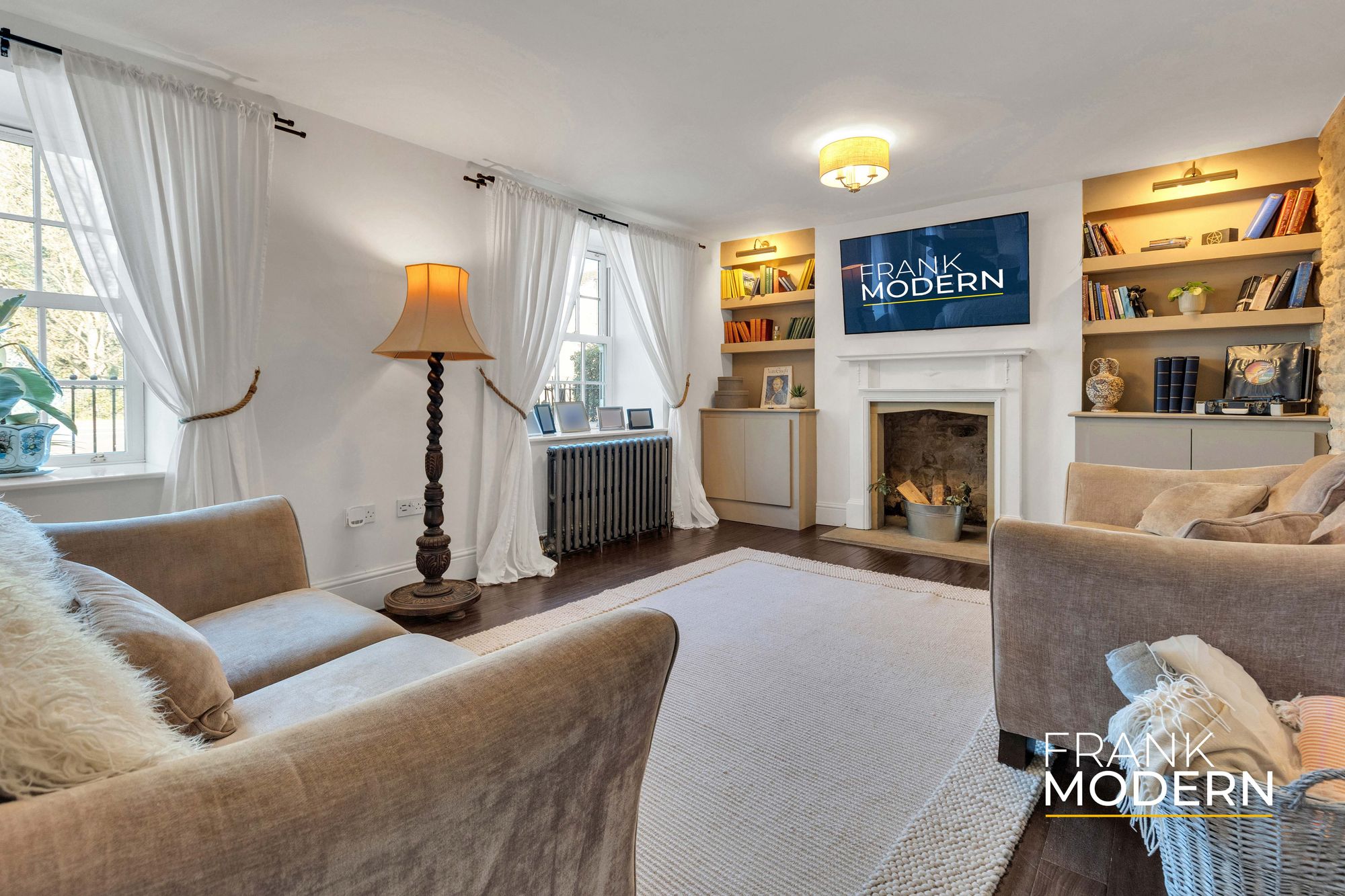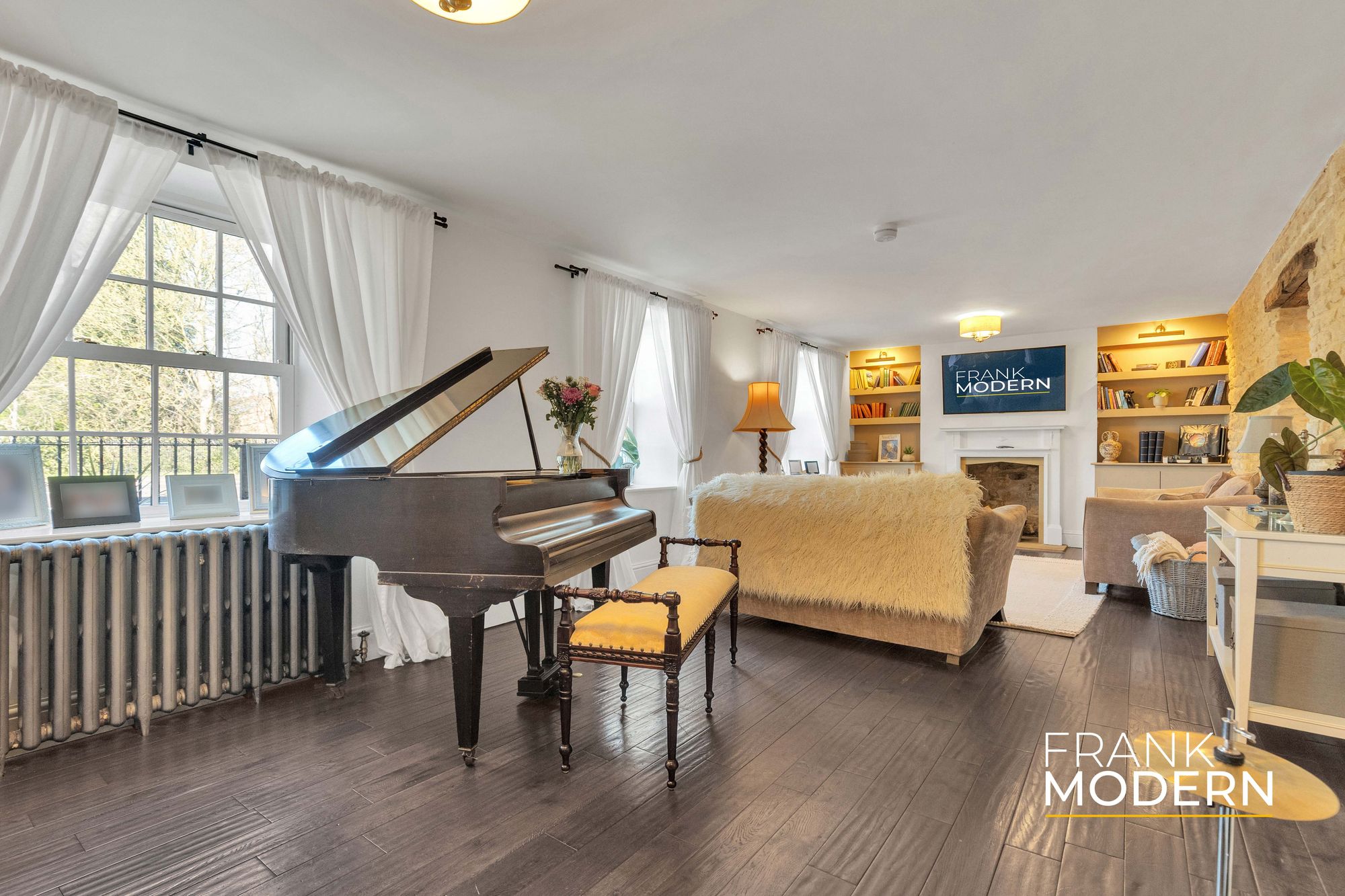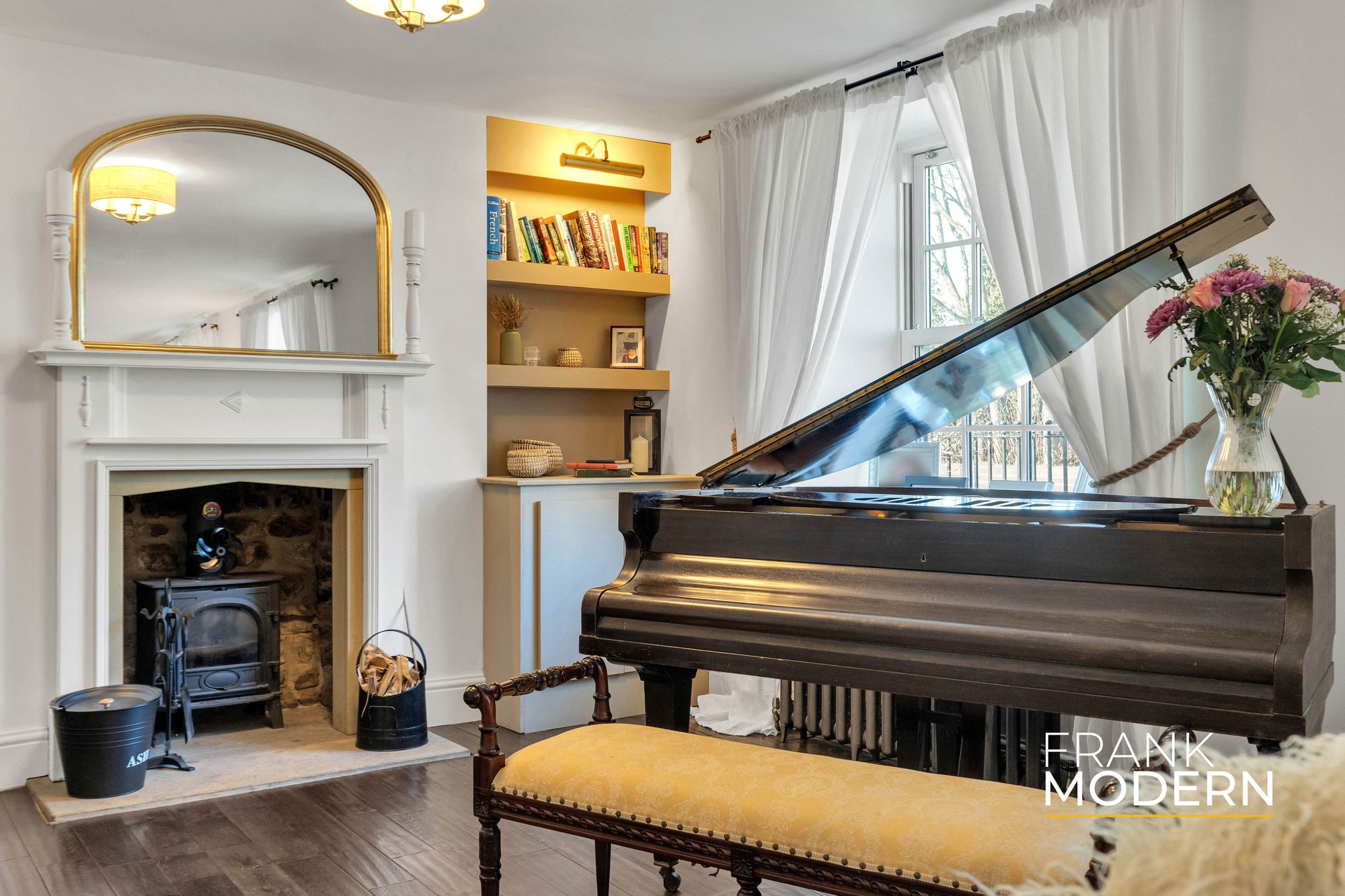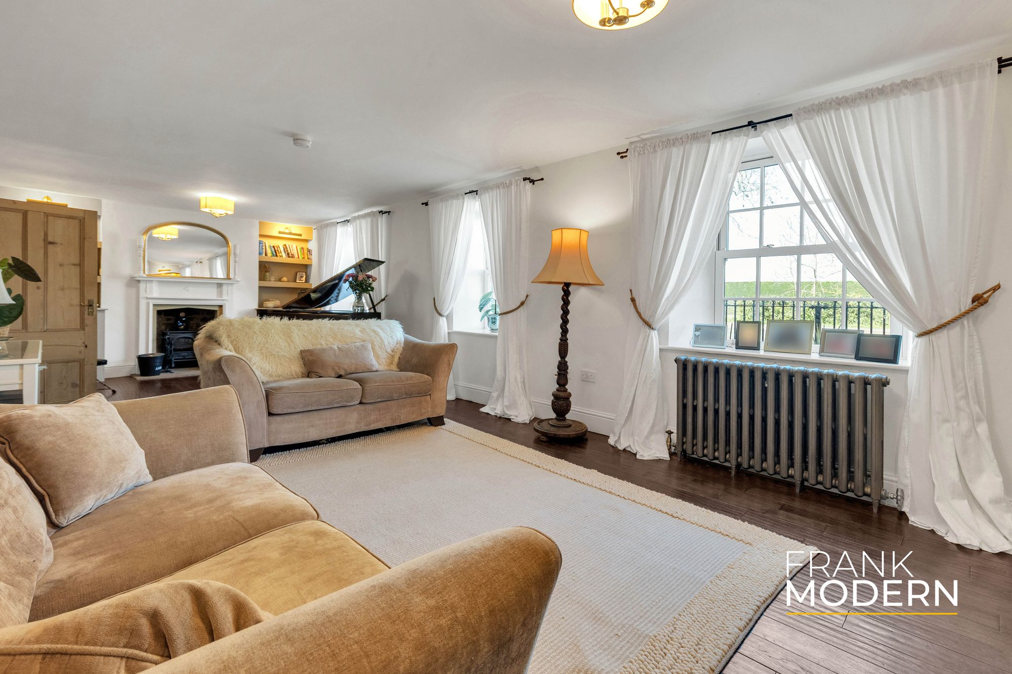 The principal lounge stretches to almost 30 feet, a room defined as much by atmosphere as by its proportions. Dual fireplaces, one with a wood burner, anchor the space, while light flows through Georgian-style windows, creating a setting equally suited to winter evenings and relaxed entertaining. A grand piano, perfectly in keeping with the scale of the room, is also included in the sale, adding a subtle sense of occasion.