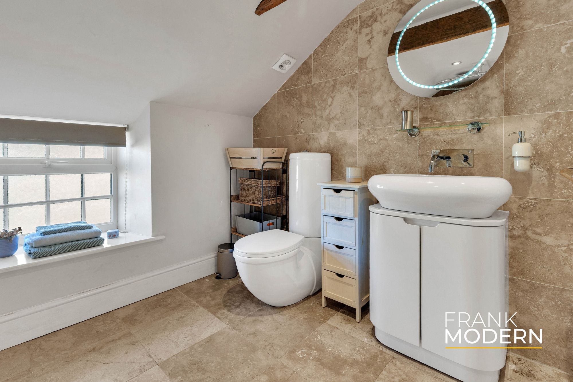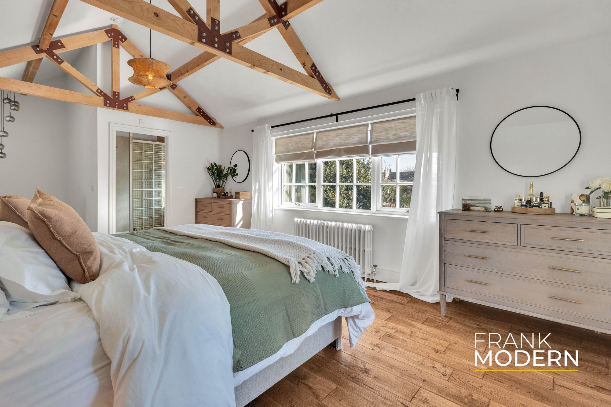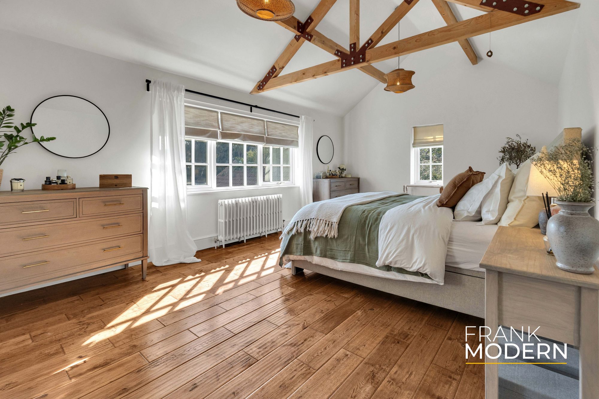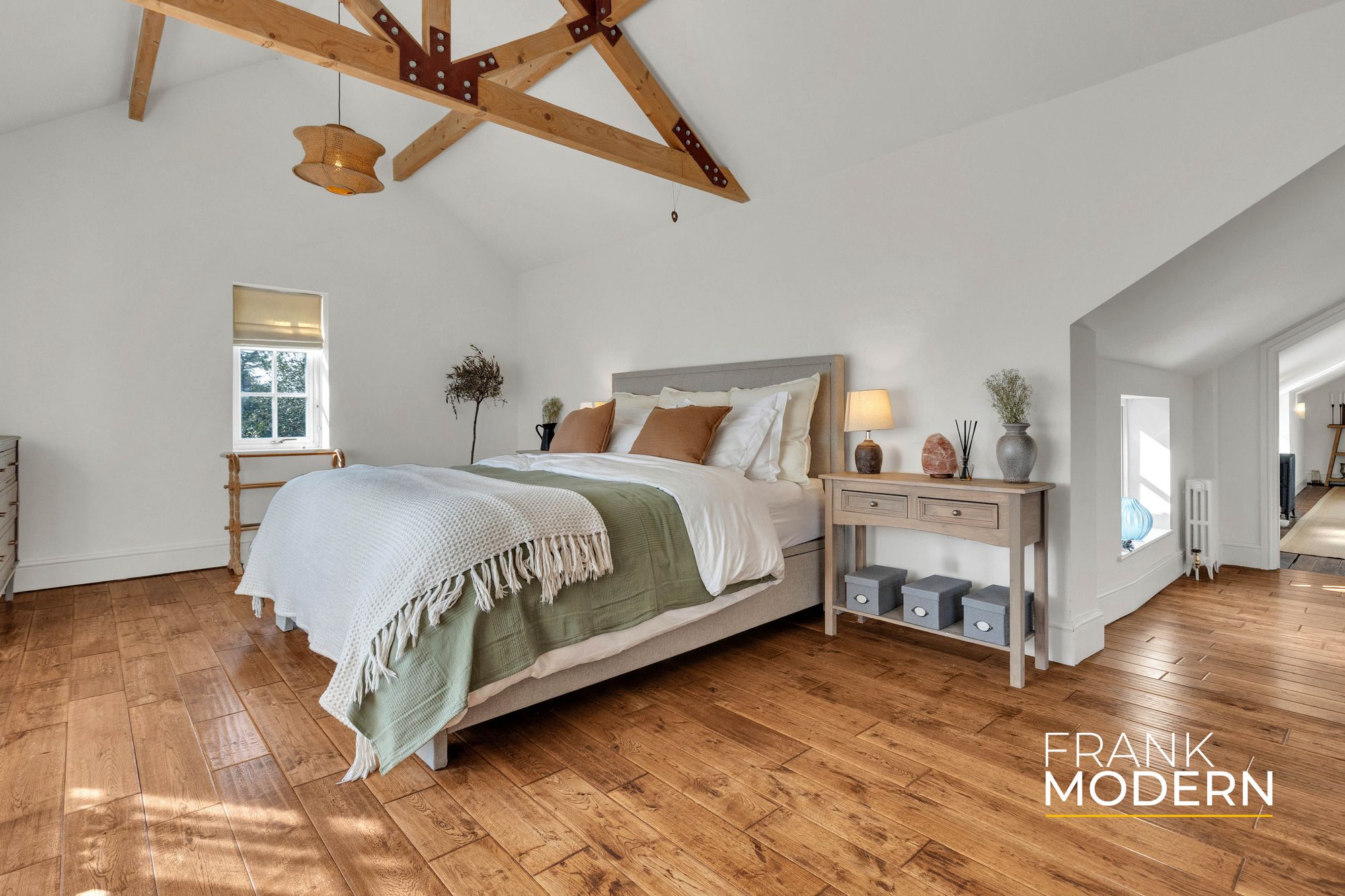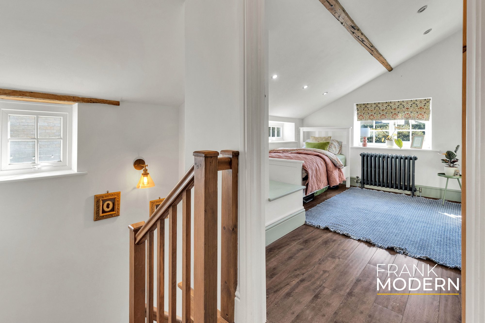 Upstairs, five bedrooms provide generous accommodation. The principal suite offers a sense of retreat, with vaulted ceilings, exposed beams, a dressing area and en suite. A second staircase adds a level of independence, ideal for multi-generational living or flexible use.